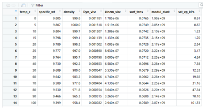 This tutorial uses two input data files for water properties and atmospheric properties: water_properties_SI.csv and standard_atmosphere_SI.csv. If not provided, they can be found here. They can be downloaded and copied into a new directory (folder) you create for this exercise or can be read in directly from github, which is demonstrated below. In general, each R project should have its own directory, which is referred to as a working directory – this is where R will look for input files and where it will write any output. Setting a working directory is described below.