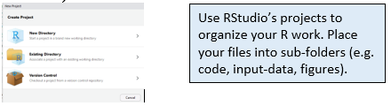 Open RStudio, and start the new project in a new directory (this is a good practice – different projects should always be in different folders!).