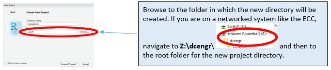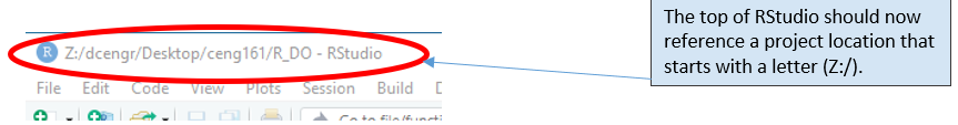 A simple fix is to open Windows Explorer and navigate to Z:\dcengr\ and then to your folder with the R project.
