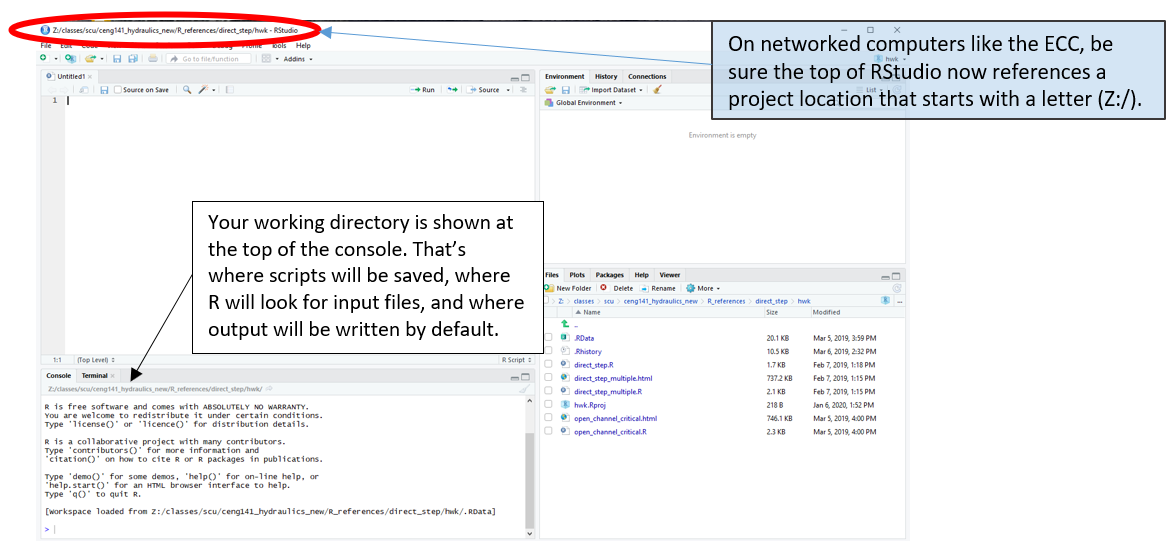 The R and RStudio software are also available on ECC computers. If using it there, you will need to watch a few details as noted below. RStudio does not always work well with networked file locations.