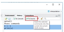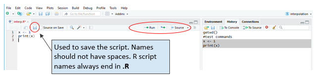 Click the save icon for the new script and rename it from Untitled to something like “interp.R” (File Names for R scripts always end with “.R”). The new name appears on the tab.