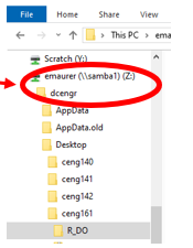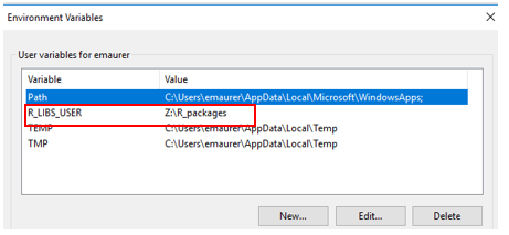 On networked drives, R will look for certain places where it can download libraries and packages. R can work with drives that start with a letter (such as Z:\) but cannot work with network addresses (like \\machine\…). On the engineering lab computers, Z:\ and \\samba1\username are equivalent, so you just need to tell Windows and R that these are the same. R looks for certain locations based on something called environment variables, so you have to set that.