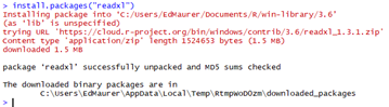If there is error message, it needs to be installed using install.packages. For example on a personal computer (but not the networked ECC computers) you would type install.packages(“readxl”), and then the library(readxl) command would work and the functions in the package would be available. The package will download from CRAN (the Comprehensive R Archive Network); if you are prompted to select a ‘mirror’, select one that is close to your home. To do this on a networked system like in the lab, you first need to set up a few things, as follows.
