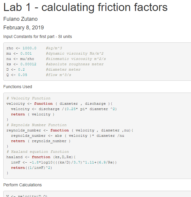This may need to be done many times in the course of hydraulics calculations, so automating it with a script will be very useful. A script will also allow the clear outlining of steps used to do any calculations, something necessary for anyone following your work. What follows is a short exploration of using R and RStudio to produce technical calculations in a professional format.