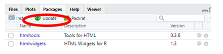 As packages evolve or R is updated, packages sometimes need to be updated. If you receive a warning indicating this, in RStudio simply go to the packages tab in the lower right panel, click update, and select the packages you need to update.