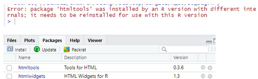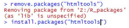 At the console, type commands to remove and re-install the package. This example is for the htmltools package, which was the source of the error above.