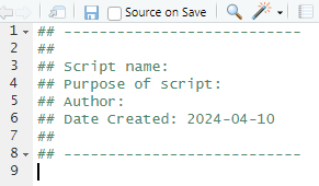 An excellent approach to creating a final document is to write everything as R markdown (saved as “.Rmd” instead of “.R”) and then compile or knit the document, but that is beyond the scope of what we’ll do here. You can read about creating a Rmd file in many references, including those above and the chapter on Reporting in Stauffer et al. For now, just add the header information above to your “.R” script and be sure the code is neat and clearly documented (described at the beginning of this document). A simple example is available here. Refer to that to see how blank lines, documentation, and occasional lines beginning with #’ can help produce better output.