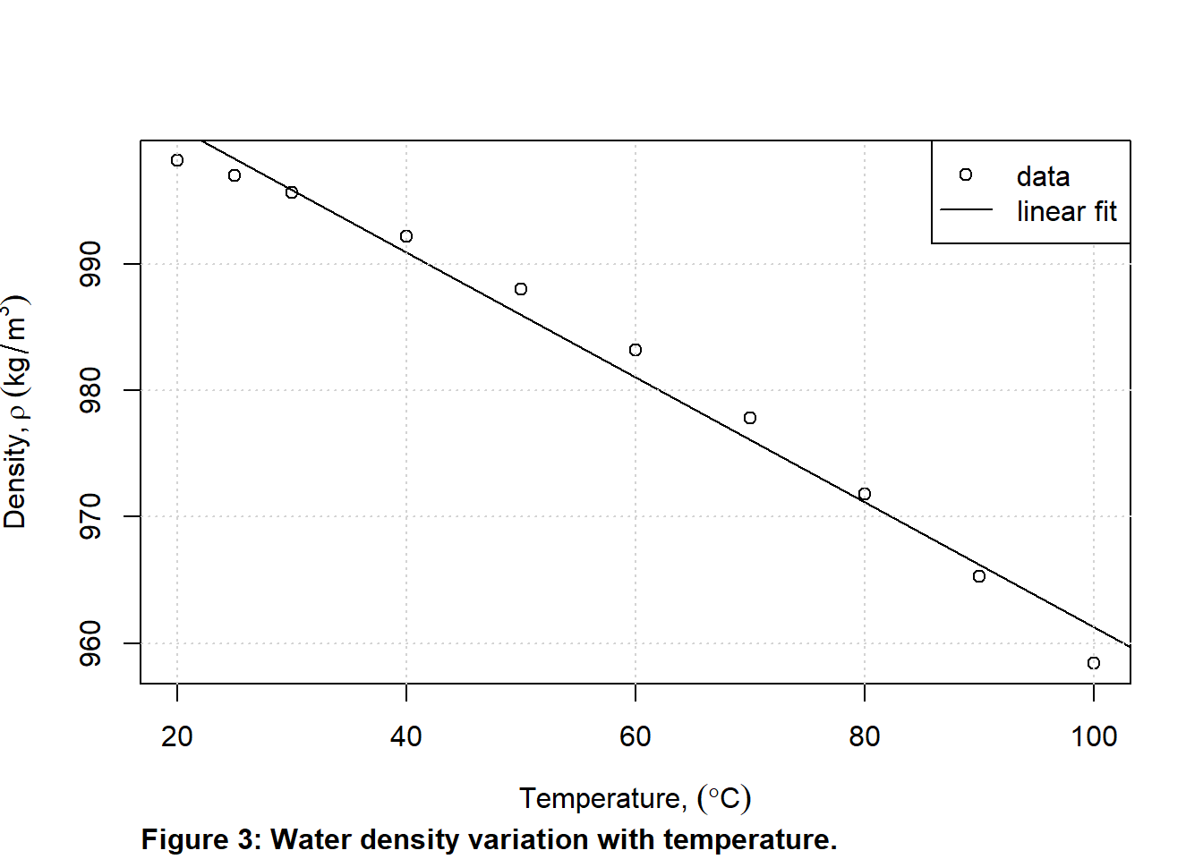 Now suppose you need to estimate the density of water at 44 C. The two pairs of temperature and density that surround 44\(^\circ\)C are (40\(^\circ\)C; 992.2 kg=m\(^3\)) and (50\(^\circ\)C; 988.0 kg/m\(^3\)). So, to estimate the unknown density using linear interpolation you can apply the following: \[\rho'=992.2+(988.0-992.2)\frac{(44-40)}{(50-40)}=990.52\]