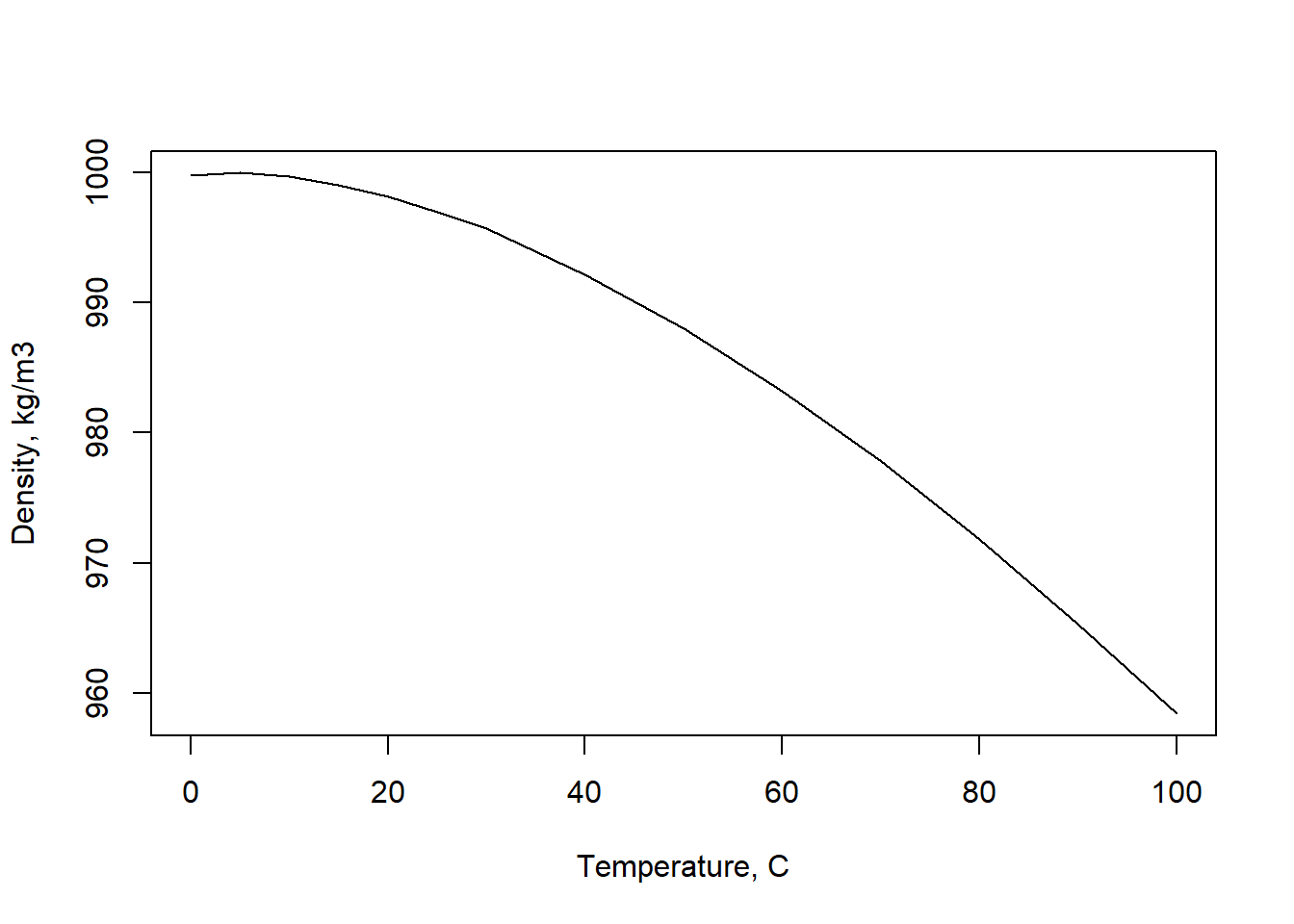 plot(temps, densities, xlab="Temperature, C", ylab="Density, kg/m3", type="l")